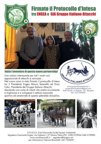 Nella convinzione che per lo sviluppo di qualunque disciplina, e quella degli attacchi nel nostro caso, sia molto importante creare e ampliare i rapporti di collaborazione, il GIA ha recentemente sottoscritto un nuovo rapporto con l’E.N.G.E.A. (Ente Nazionale Guide Equestri Ambientali), sottoscrivendo un PROTOCOLLO DI INTESA.