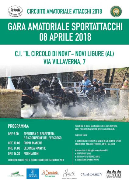 Il secondo appuntamento è per domenica 8 Aprile a Novi Ligure (AL) presso Il Circolo di Novi, dove avrà luogo la finale del Trofeo Invernale sempre all’interno del Circuito Amatoriale Attacchi Fitetrec-Ante/GIA. Consegna dei Trofei e premi di Tappa offerti da La Galleria del Cavallo di Ivrea e dal Circolo di Novi. Categorie in gara: Singolo Junior, Singolo Pony, Pariglia Pony, Singolo Cavalli e Pariglia Cavalli. Per la locandina clicca qui