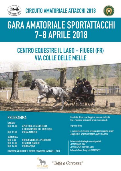 Il fine settimana vede due appuntamenti per lo Sport Amatoriale targati Fitetrec-Ante /GIA, il primo parte a Fiuggi nel Lazio già da sabato 7 Aprile. Una due giorni collaborazione con Caffè e Carrozze e con il Centro Equestre IL LAGO nella bella riserva naturale di Canterna a Fiuggi. Si registra la partecipazione anche di concorrenti dalla Calabria e dalla Puglia. La domenica mattina seconda manche e premiazioni. Per la locandina clicca qui