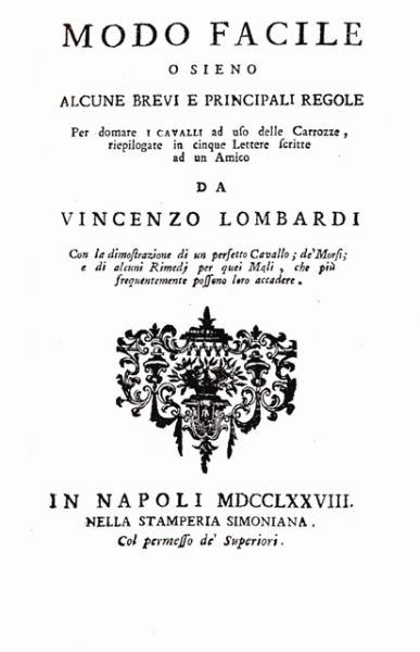 Vincenzo Lombardi, Modo facile o sieno alcune brevi e principali regole per domare i Cavalli ad uso delle Carrozze, riepilogate in cinque lettere scritte ad un Amico da Vincenzo Lombardi Con la dimostrazione di un perfetto Cavallo; de’ Morsi, e di alcuni Rimedi per quei Mali, che più frequentemente possono loro accadere. Napoli, Stamperia Simoniaca, 1778, pp. 71, 8°.